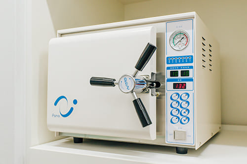 歯科医療を提供する場である歯科医院は、患者さんに安心して治療を受けていただけるように院内を常に清潔に保ち、衛生管理を徹底することが欠かせません。当院では、エプロンやコップなどは使い捨てのものを使用し、使用した機器はその都度、世界最高レベルの滅菌機用いて滅菌をしています。また、お手洗いにもUV照射器を設置し、院内には高性能の空気清浄機で、共用部も定期的に消毒するなど、院内全体の衛生管理を徹底しています。